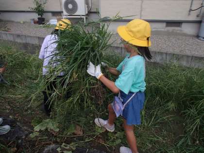 栽培ボランティアの方に協力していただきながら、生活科の学習で育てた夏野菜の片付けをしました。子供たちが、てきぱきと抜いた草を運んだり、マルチ止めを外したりしてくれたおかげで、短時間で作業を終えることができました。