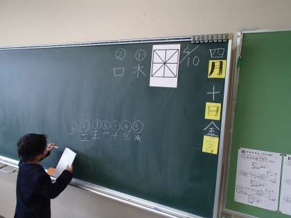 形の中に隠れている漢字を見つけ出すクイズでした。単純なクイズでしたが、子供たちは自分の知っている漢字を思い出していました。