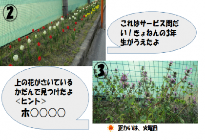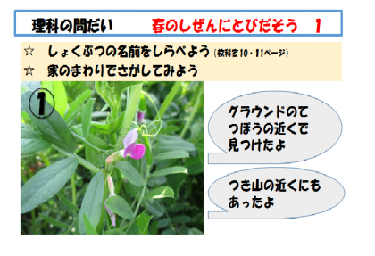 きょうは理科の問題です。春になって、学校のまわりにはたくさんのしょくぶつがかわいい花をさかせています。そこで、しゃしんをとってきました。このしょくぶつの名前をしらべましょう。教科書10・11ページのしゃしんを見てね。家のまわりでもさがしてみましょう。