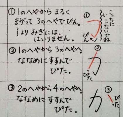 「か」は 1のせんも 2のせんも、ますの ひだりがわだけ、1と3のへやだけに かきます。はみださないんだよ。
