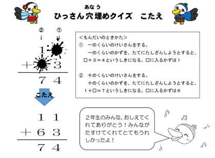 2年生のみなさんがいっしょうけんめいにクイズにとりくんでくれたおかげで、かいくんもとてもよろこんでいますよ。おうちでも、かぞくの人ときょう力しあってすごしてくださいね。