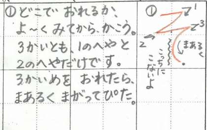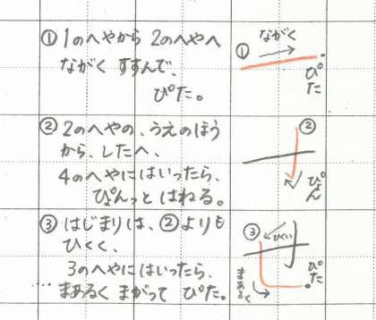 「そ」は、 1つの せんで できているけど むずかしいよ。2のへやに いくときは すこしだけ あがって かくよ。3かいめを おれたら 3のへやには いかないように かいてみよう。