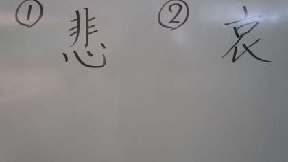 ホワイトボードに2つの漢字が書いてありますね。どちらも「かなしい」と読みます。この新型コロナウイルスの影響で、みんなも先生たちも、世界中の人も1番の悲(かな)しい思いをしています。ただ、先生たちが心配をしているのは、2番の哀(かな)しいです。この哀の漢字、下が衣という漢字に似ていませんか?これは、口を衣で隠す。つまり、「哀」という漢字は、言いたいことや悩み等を自分の心に閉じ込めるという意味です。みなさんは、2番の方になっていませんか?自分の思いを伝えるというのは大切なことですね。