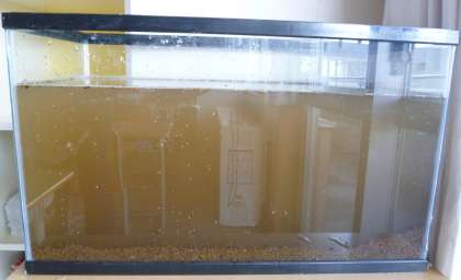 今日は新しくメダカの水槽を準備しました。この水槽を見てびっくりする人は多いでしょう。水槽の中に入れたのは赤玉土です。赤玉土は水をきれいにしてくれる土です。今日は赤玉土を入れて、その上から水を入れたので、濁っています。時間が経つとこの濁った水がどのようになるのか、楽しみにしていてください。