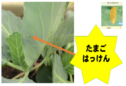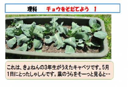 今日はモンシロチョウのお話です。学校のかんさつ池の近くに、きょねんの3年生さんがそうごうてきな学習の時間に「モンシロチョウがきてくれるように」と、キャベツのたねをまいてくれました。キャベツはよう虫の食べ物なので、おとなのモンシロチョウがキャベツの葉にたまごをうみに学校までとんできました。まずは5月1日のしゃしんからどうぞ。
