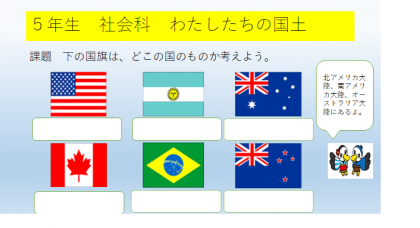 上の国旗はそれぞれどの国を示しているかな? 答えは社会科の教科書11ページを見よう。