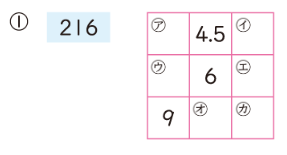 たて、横、ななめの3つの数の積が「216」、「1000」になるように数をいれよう。ノートや教科書P39にやってみよう。