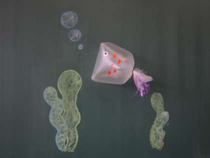 先生は、魚を作りました。ビニール袋に空気を入れて、ゴムでとめたら、シールやテープで飾りをつけて完成です!周りに絵を描いて飾ってみましたが、紙風船のようポンポンとはじいて遊ぶのも楽しそうです。