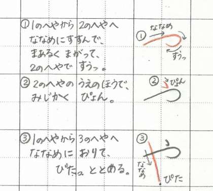 「ゆ」の 1つめのせんも むずかしいね。なんどか ゆびで ためしがきを してから えんぴつで かくといいよ。