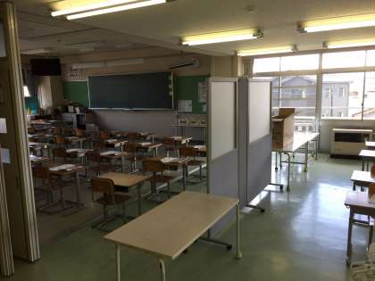 三密を避けるために、教室をオープンにし、机の配置も変更しました。
