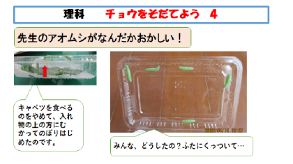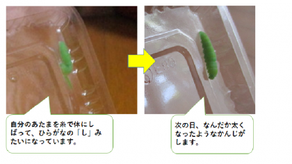 みなさんからもらったおたよりの中に「モンシロチョウのよう虫をそだてています」というものがありました。チョウになるまでかんさつできると、楽しいですね。ところで、学校で先生がそだてているアオムシに、いつもとはちがったようすが見られました。今日はそれをしょうかいしますね。