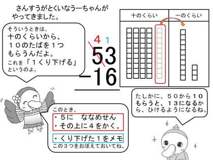 「くり下がりってなに?よくわからない!」というかいくんのために、うーちゃんがくり下がりをおしえてあげているようです。下のおはなしを読んでみてください。