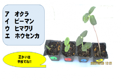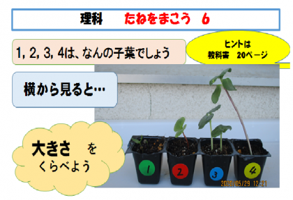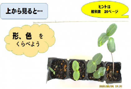 今日は、ひさしぶりのクイズです。しゃしんの子葉はなんのしょくぶつかな?教科書をよく見て、色、形、大きさのとくちょうをくらべてみよう。これであなたもかんさつ名人です。