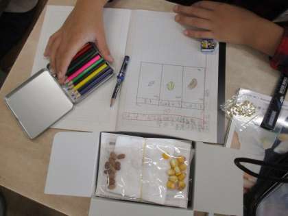 インゲンマメ、イネ、トウモロコシ、それぞれの種子を見て、大きさや色、形などを丁寧に観察しました。
