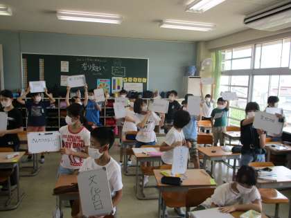 新型コロナウイルス感染症予防のために、ペア・グループ活動を控えていますが、6年生には、一人一人のホワイトボードがあります。ホワイトボードであれば、全員が自分の考えをしっかりと表現できます。子供たちは、楽しんで活動していました。