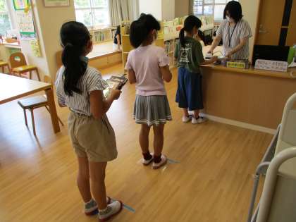 図書室で本を借りました。司書の先生に本の貸し出しの仕方について教えていただき、約束を守って借りていました。久しぶりに借りるので、本棚や新刊コーナーを往復し、真剣に本を選んでいる子供たちでした。