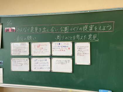 6年生の社会科の学習では、自治体の取組について学習をしています。自分たちが公園をつくる行政側であるとすれば、どのようなコンセプトを大事にして進めていくのか考え、発表しました。