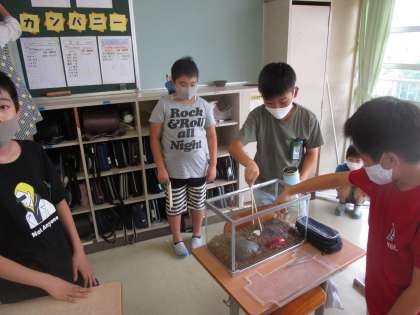 6時間目、どのクラスも楽しそうです。1組は家にあるものでいい音を出しそうなものを持ってきて、音合わせをしています。2組の係活動では、同じ係のメンバーとの距離を意識してカナヘビの世話をしていました。