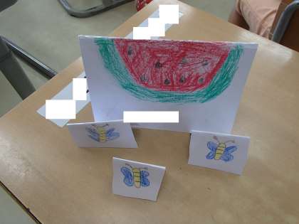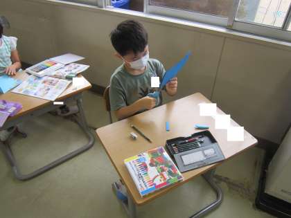 紙を折って、立った形から想像をふくらませて、作品をつくりました。自分なりに工夫しながら楽しんで活動しました。