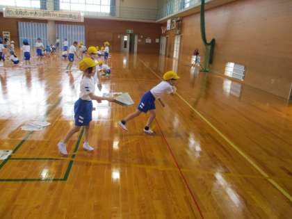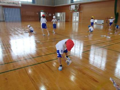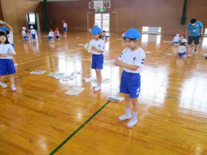 体育科の学習で、紙鉄砲をつくり、音を鳴らして遊びました。斜め上から振り下ろす運動になり、投げる動作につながるといいなと考えています。腕の振り下ろし方によって、音の鳴り方が変わってくるのも面白いです。パーンと大きな音が鳴り響いたときの気持ちよさも味わうことができたようです。また、家でも挑戦してほしいと思います。広告や新聞紙を持たせてくださるなど、ご協力ありがとうございました。