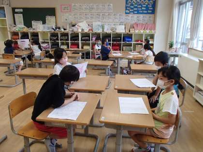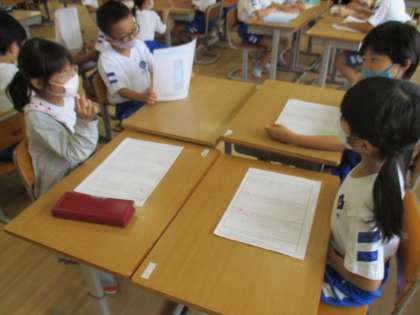 国語科「あったらいいな こんなもの」の学習で、友達と発表し合い、質問したり、感想を伝えたりする活動をしました。発表するときには、「です」「ます」などの丁寧な言い方をしました。あったらいいなと思うわけ、働き、特徴等をしっかりと友達に伝えることができました。