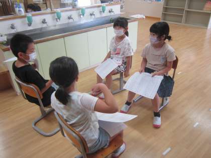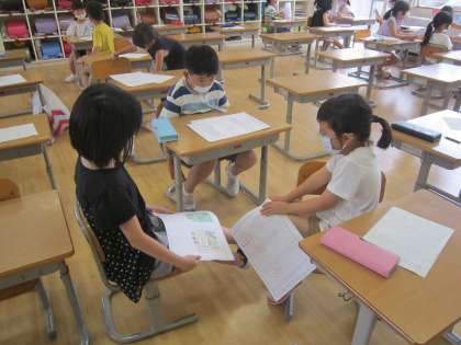 国語科の学習で、自分が考えた「あったらいいな こんなもの」のグループ発表会をしました。発表するときの姿勢や声の大きさ、丁寧な言い方に気を付けて話したり、うなづきながら聴き、相手のよいところを伝えたりしました。振り返りでは、「相手に分かりやすく伝えることができた。」「『本当にあったらいいね』と言えた。」などの意見が聞かれ、充実した発表会になったようです。