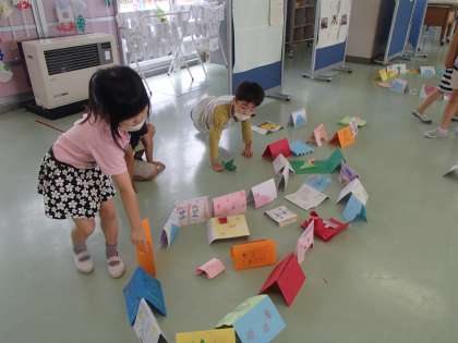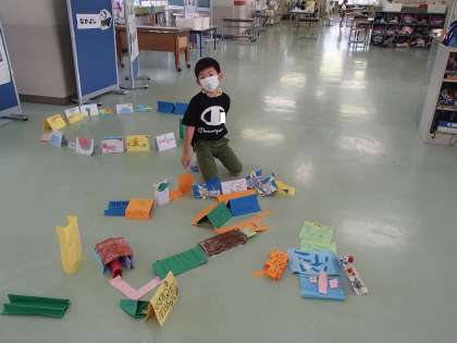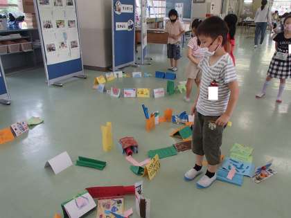 図画工作科で、一人一人が折り方や立て方を工夫してつくったものを、クラスみんなで並べて楽しみました。