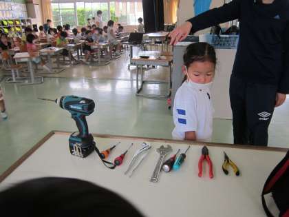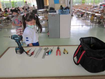 用務員さんが使用している器具を実際に見て、「どのように使うのかな?」「ぼくも使ってみたいな。」と、興味をもちながら学習することができました。