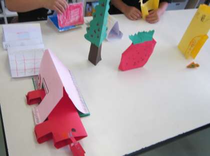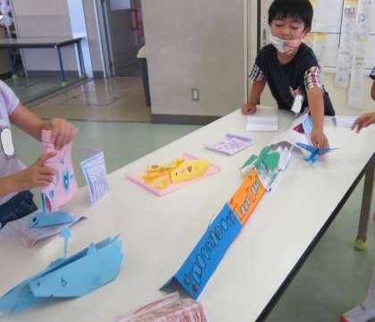 図画工作科の学習「おって たてたら」でつくった作品を並べたら、海の世界、乗り物の世界、お店や家が集まった楽しい町ができました。