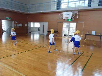 1・3組でボール投げゲームをしました。子供たちは、段ボールやペットボトル等の的をねらって、玉を投げます。遠くまで届くように強く腕を振ったり、ねらいを定めて玉がまっすぐ進むようにしたりと工夫して投げることができるようになってきました。集中してゲームを楽しんでいます。