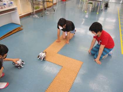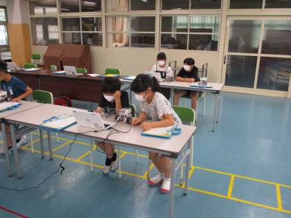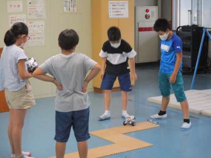 3,4組のプログラミング学習の様子です。操作の仕方を聞き、車をゴールまで進めようとがんばりました。何度も失敗しながらも、楽しそうに調整している子供たちでした。