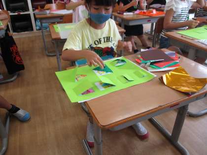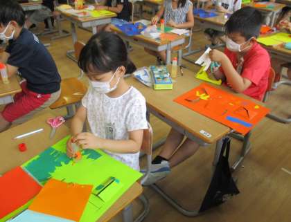 図画工作科「まどをひらいて」の学習を行っています。安全に気を付けてカッターナイフを使い、窓の部分を切り開いた後に、窓の中の絵を描いたり周りの飾りを付けたりしています。窓を開くと何が出てくるか、わくわくするような作品になるよう楽しんで活動しています。