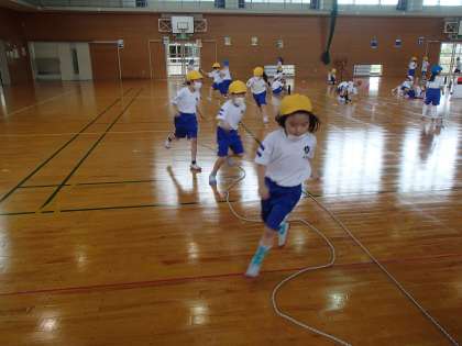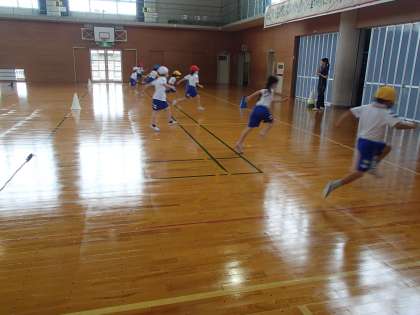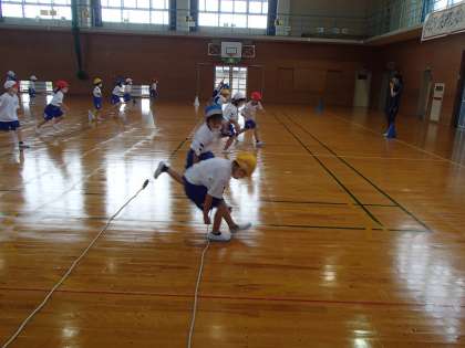 体育の時間に、「はばとびあそび」をしています。大股で走ったり、縄でつくった川を跳び越えたりしました。体を傾けたり、自分が跳び越せそうなところを見付けたりしながら、力いっぱい走っていました。