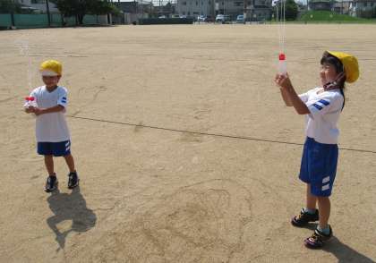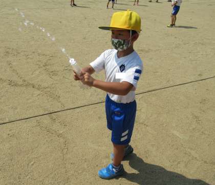 各々が持ってきたペットボトルやマヨネーズの容器に水を入れ、水鉄砲にしました。