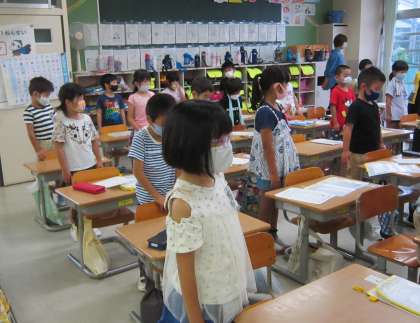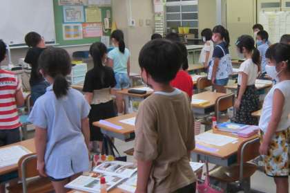 小学校に入学して初めての終業式は、熱中症対策のため、教室で行いました。放送で校長先生が、1学期にがんばっていたことや成長したことをたくさんほめてくださいました。そして、命を大切に、目当てをもってよい夏休みを過ごせるよう励ましてくださいました。子どもたちは、真剣に校長先生のお話を聞いていました。