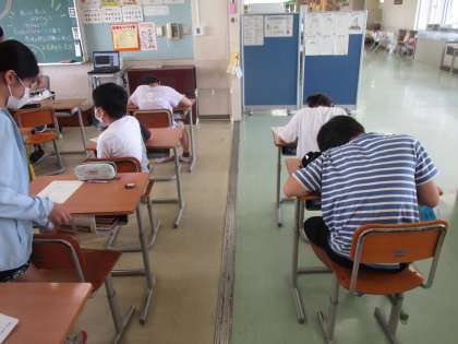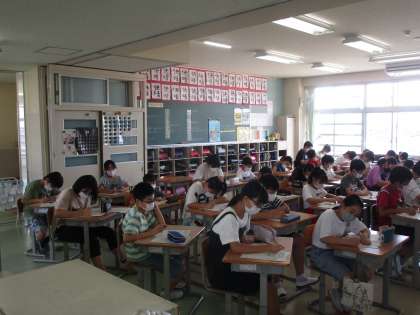 2学期への意識を高めた後、これから個人としてがんばりたいことや学校、学年に対してがんばりたいことなどを文字に書き表すことで一層決意を固くしました。