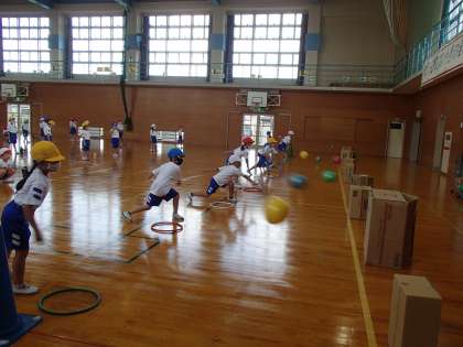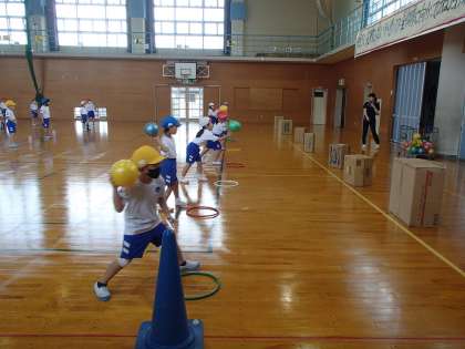 体育でボール投げ遊びをしました。段ボールの的に当てたり、的を跳び越えるように投げたりしました。