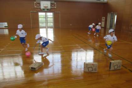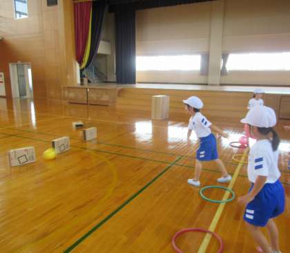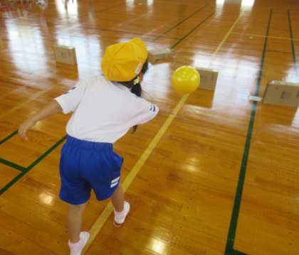 団毎に的に向かってボールを投げました。「2個倒すことができたよ」「球を速く投げられるようになったよ」などの声が聞かれました。