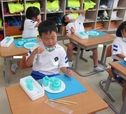 図画工作科の時間に、粘土でごちそうをつくりました。