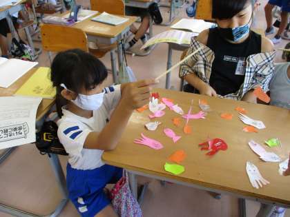 暑い日が続き、休み時間の過ごし方も限られています。そんな中、工作係の子供たちが「釣りゲーム」を考えてくれました。やってみると意外と難しく、子供たちは真剣な表情で挑戦していました。