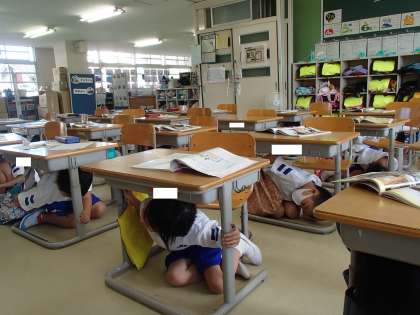 地震が起こった想定で、子供たちは、素早く机の下に入り、自分の頭を守る行動をとりました。