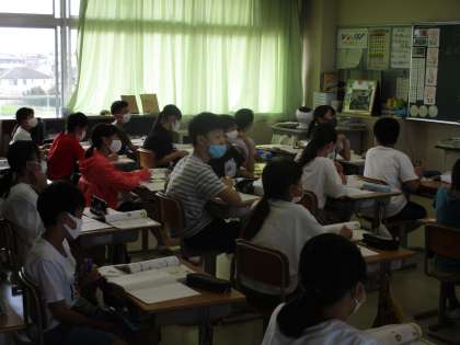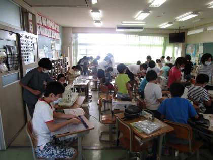 学習は各教室、順調に進んでいます。1組は、家庭科のミシンです。去年のことは覚えているかな?2組は、算数科です。色の塗られている部分の面積を求めます。