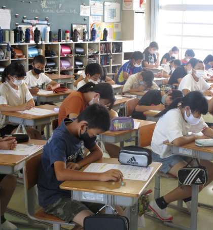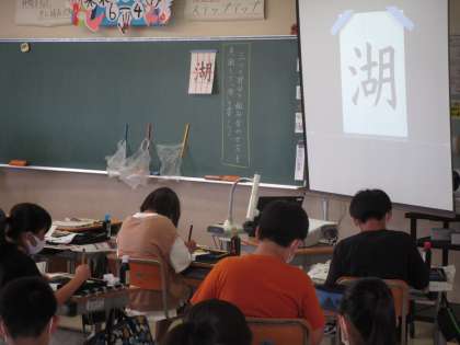 3組はテストを受けています。さぁ、習ったこところを覚えていますか?4組は、書写です。「湖」は3つの部分からなる漢字です。バランスを考えて書こう。
