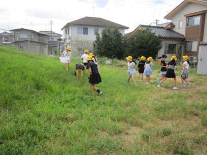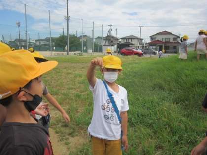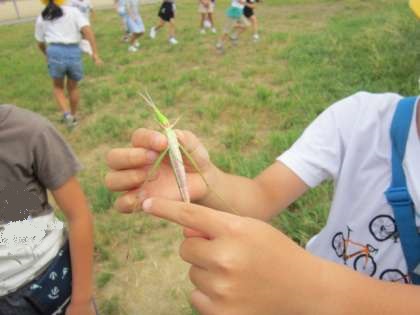 理科で昆虫のからだを調べました。実際に築山にいたバッタやキリギリスを見てみると「ほんとだー!」「足が6本ある!」「教科書と同じだ」と楽しそうに観察していました。