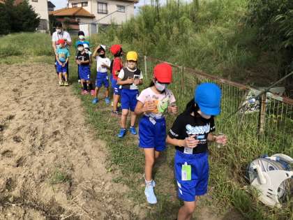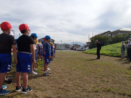 いよいよ、待ちに待った野菜の種植えの日です。築山の前に集まり、お世話になるボランティアの方々に元気よく挨拶をすることができました。今回は野菜の種類ごとにグループに分かれ、個別に植え方を教えていただきました。どきどきしながら畑に向かっています。