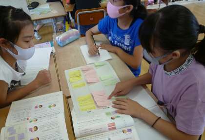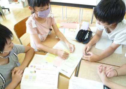 国語科では、よりよい学校にするために、グループで話合いをしています。付箋に自分の考えを書き出し、グループの中で一人一人の考えを類型化しながら、解決方法をまとめていきました。最初はたくさんの考えをどのようにまとめていけばよいか分からなかった子供たちも、話合いを重ねるにつれて、活発に自分の考えを言うことができるようになりました。