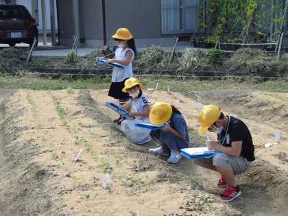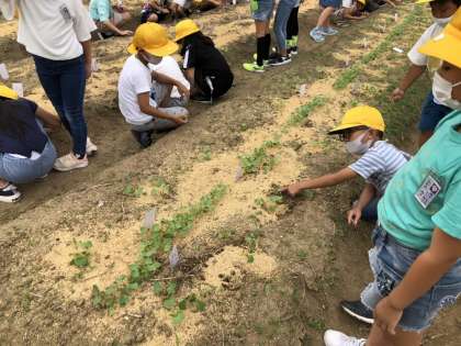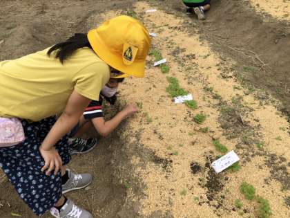 大根とかぶの芽が、続々と出てきました。子供たちは、葉の大きさや形、触った感じ等をよく観察しました。水やりも毎日行っており、「人参の芽も早く出てくれないかな〜」と願っている子供たちでした。