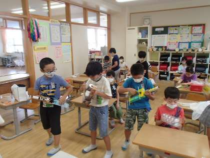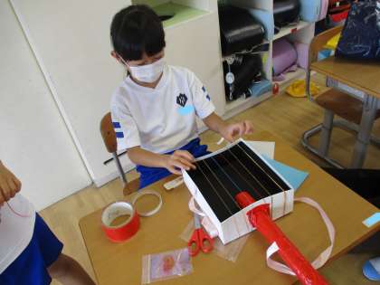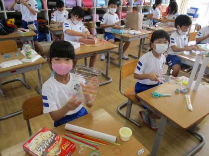 図画工作科、音楽科の学習で身の回りにある物を使い、楽器をつくりました。箱やペットボトル、空き缶等を使って、音の出し方や飾りを工夫しました。叩く、弾く、擦る、振るなどいろいろな音の出し方があることに気付き楽しんでつくっていました。最後には、音楽に合わせてのりのりで演奏する子供たちでした。材料集めにご協力いただきありがとうございました。