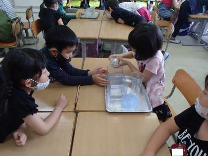 算数科で、「どちらがおおい」の学習をしています。身の回りにあるペットボトルや紙コップを使い、実際にやってみながら、水のかさを比べています。