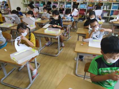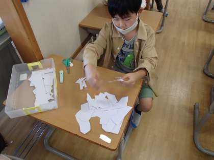 はさみをジグザグ、くるくるなど自由に動かすと、いろいろな形ができあがりました。「雷みたい!」「滑り台に見えるよ。」と切った形が何に見えるか考えて並べ、楽しく作品をつくる子供たちの姿が見られました。